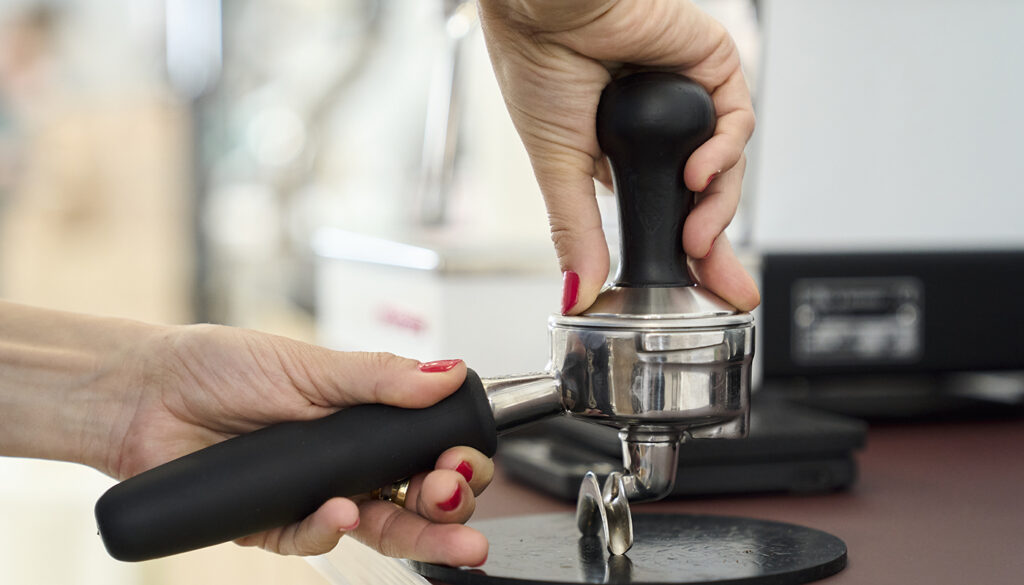 Placer portafilteret på en vandret flade. Tag din tamper og tryk med et fast tryk ned i kaffen, så kaffen komprimeres. Fjern overskydende kaffe fra kanterne.